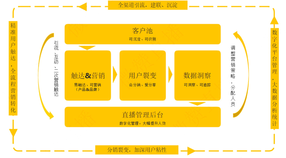 传统企业营销获客成本高、触达营销难、用户裂变差、数据洞察不清晰,短视频营销打造营销闭环,驱动企业增长。搭建品牌私有流量池,全渠道引流、转化。完美承接公域流量,打造完整流量闭环。