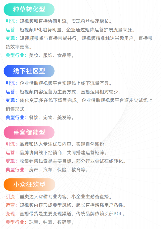 目前,在短视频平台“种草转化型”行业拥有大量品牌、商家和达人入驻,他们通过垂类短视频内容和直播协同引流,实现私域流量的积累。